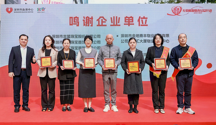吉盟集团作为活动发起单位,被深圳市血液中心授予“爱满水贝”无偿献血联合公益行动“创始单位”荣誉。