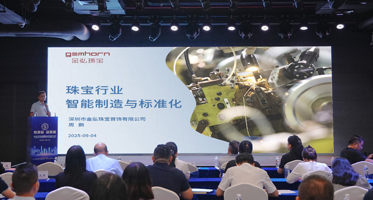 金弘珠宝总经办总监周鹏在深圳标准认证赋能珠宝行业专场宣介活动上,围绕首饰智能制造发表主题演讲