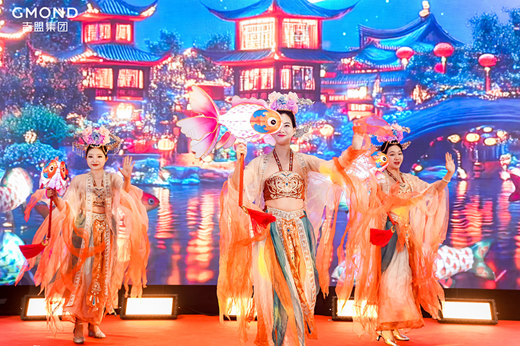凤箫声动,鱼龙灯舞。晚会以鱼灯舞《龙马乾坤》盛大开场。舞者以灵动舞姿演绎锦鲤逆流向上,化龙飞升的神话传说,致敬吉盟人逆流而上,破局向新的先锋精神。