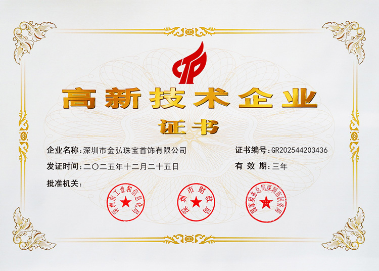 近日,金弘珠宝凭借持续的研发投入、卓越的智造实力和丰硕的创新成果,顺利通过2025年国家级高新技术企业认定复评,成功蝉联这一国家级荣誉资质。这标志着金弘在首饰智能制造领域的研发体系和创新实力再次获得国家层面的高度认可与肯定。
